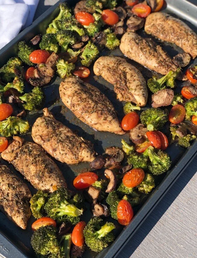 An easy sheet pan balsamic chicken recipe with veggies. The chicken is baked in the oven with mushrooms, broccoli, and tomatoes for a complete meal made in less than 30 minutes.