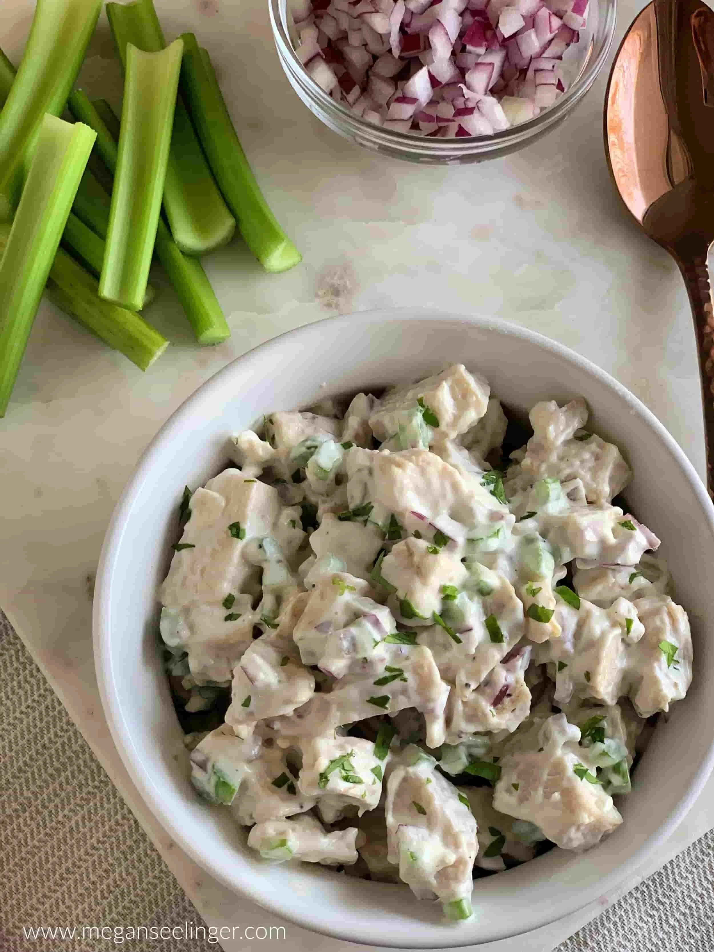 Dill Pickle Chicken Salad, made with oven-baked, slow cooker, or Instant Pot chicken, crunchy pickles, red onion, fresh dill, mayo, and garlic. It’s an easy way to mix up your Whole30, Paleo, and Low Carb weekly meal prep!
