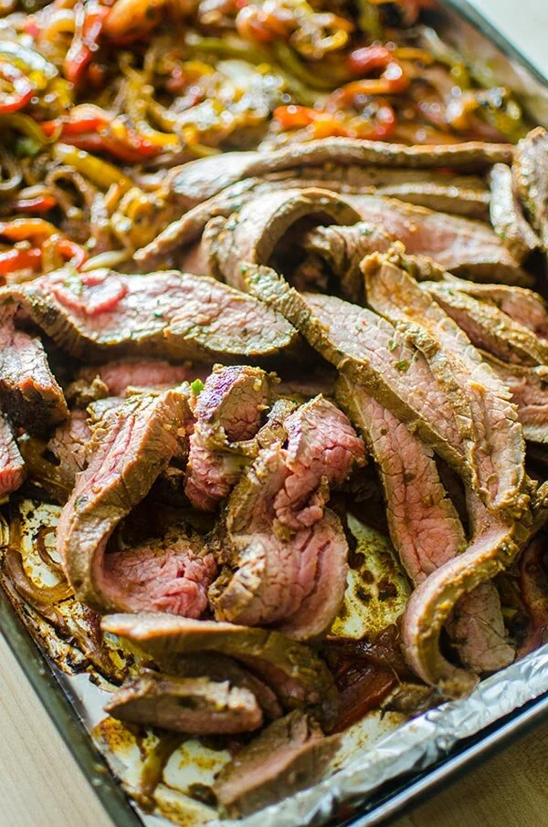 Sheet pan flank steak fajitas are cooked under the broiler for a fast and easy one-pan dinner, with bell peppers and onions.