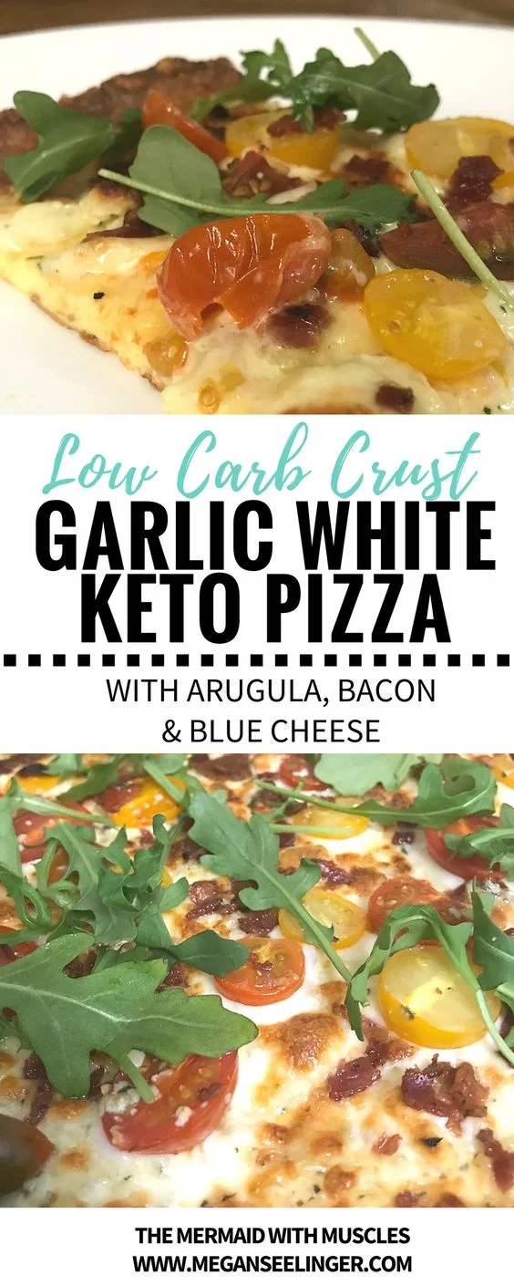 This pizza recipe has a keto pizza crusts primarily made of cheese, a garlic white pizza sauce perfect for any keto meal plan and some of my favorite pizza toppings, arugula, tomatoes, bacon and blue cheese.